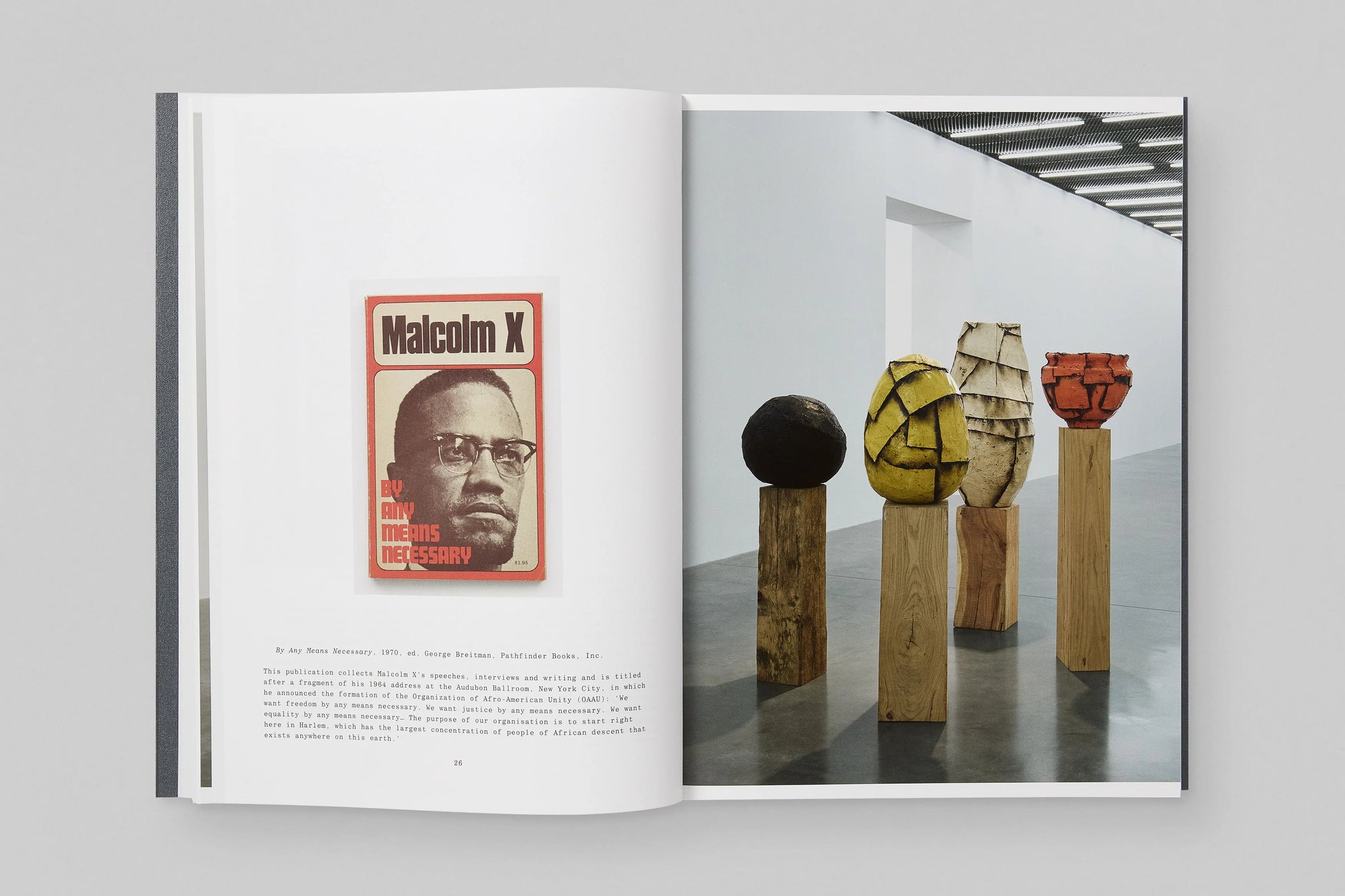 Fitted with a silver screen-printed cover and designed by Studio Ardworks, the catalogue walks the reader through the exhibition, illustrating a series of architectural interventions, sculptures, archival materials, and new film work. Beginning with an introductory essay by emerging Malcolm X scholar, Najha Zigbi-Johnson, the book also features a dynamic conversation between Gates, curator Zoé Whitley, and artist John Akomfrah, who together discuss subjects of the aesthetics of Black militancy, artistic solidarities and personhood.