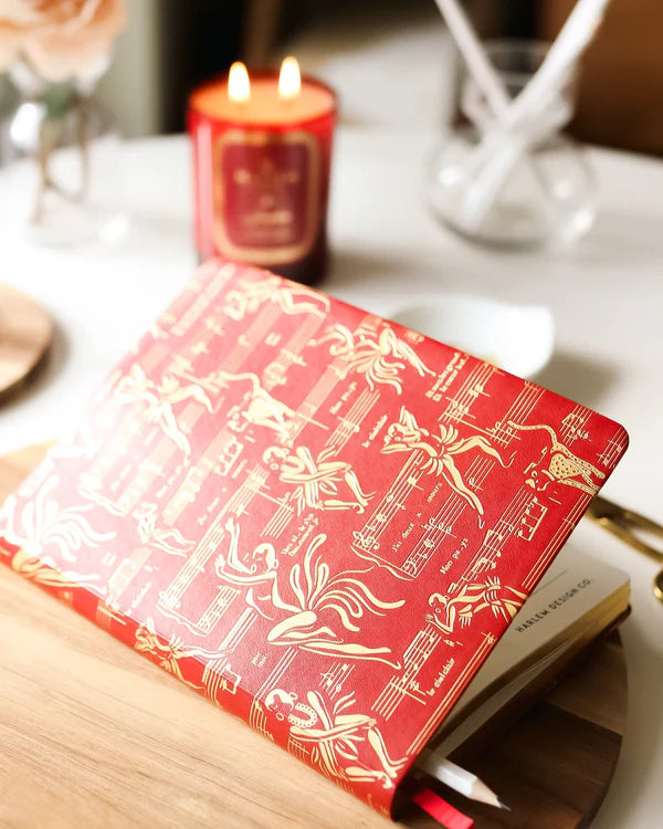 Hand-bound with care and attention to detail, this journal features a soft vegan leather cover accented with gold foil detailing. Inside are 150 sheets (300 lined pages) with gilded edges, complemented by a crimson satin ribbon bookmark and an elastic book closure for secure keeping.
